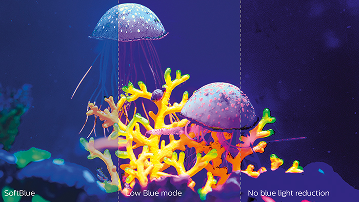 SoftBlue LED bruker smartteknologi til å redusere skadelig blått lys med kort bølgelengde uten at det påvirker skjermfargen eller -bildet. SoftBlue LED-teknologi er sertifisert av den internasjonale testorganisasjonen TÜV Rheinland for å redusere skadelig blått lys.