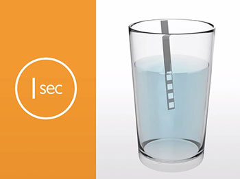 Du skal bruke en teststrimmel for å måle vannets hardhet (kalk- og magnesiuminnholdet i vannet fra springen). Dypp teststrimmelen i vannet i kun ett sekund, vent deretter ett minutt. Kontroller så teststrimmelen: se hvor mange ruter som har blitt markerte samt hvilken farge de har.